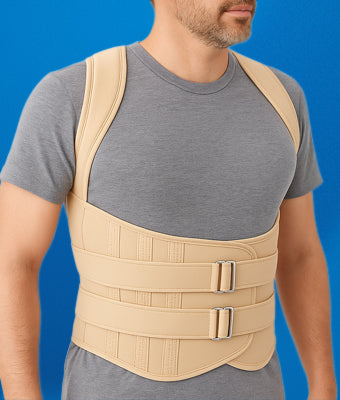 Faja dorsolumbar en color beige, fabricada con material elástico transpirable y refuerzos semirrígidos para proporcionar estabilidad a la zona lumbar. Su diseño anatómico permite reducir la presión en la espalda baja y mejorar la postura. Incluye bandas ajustables de velcro para una mejor sujeción.