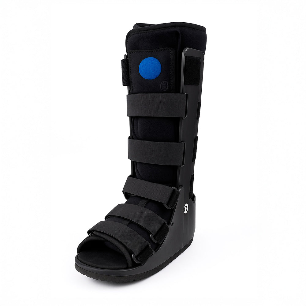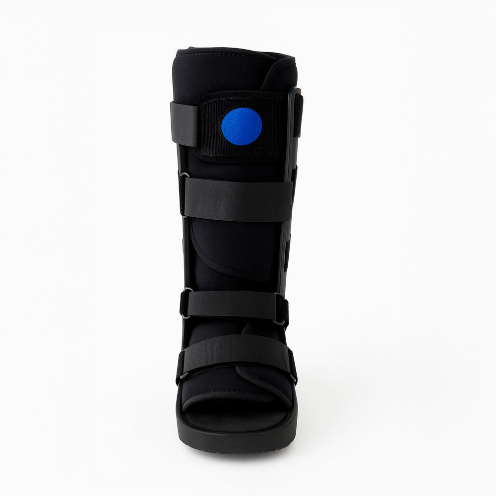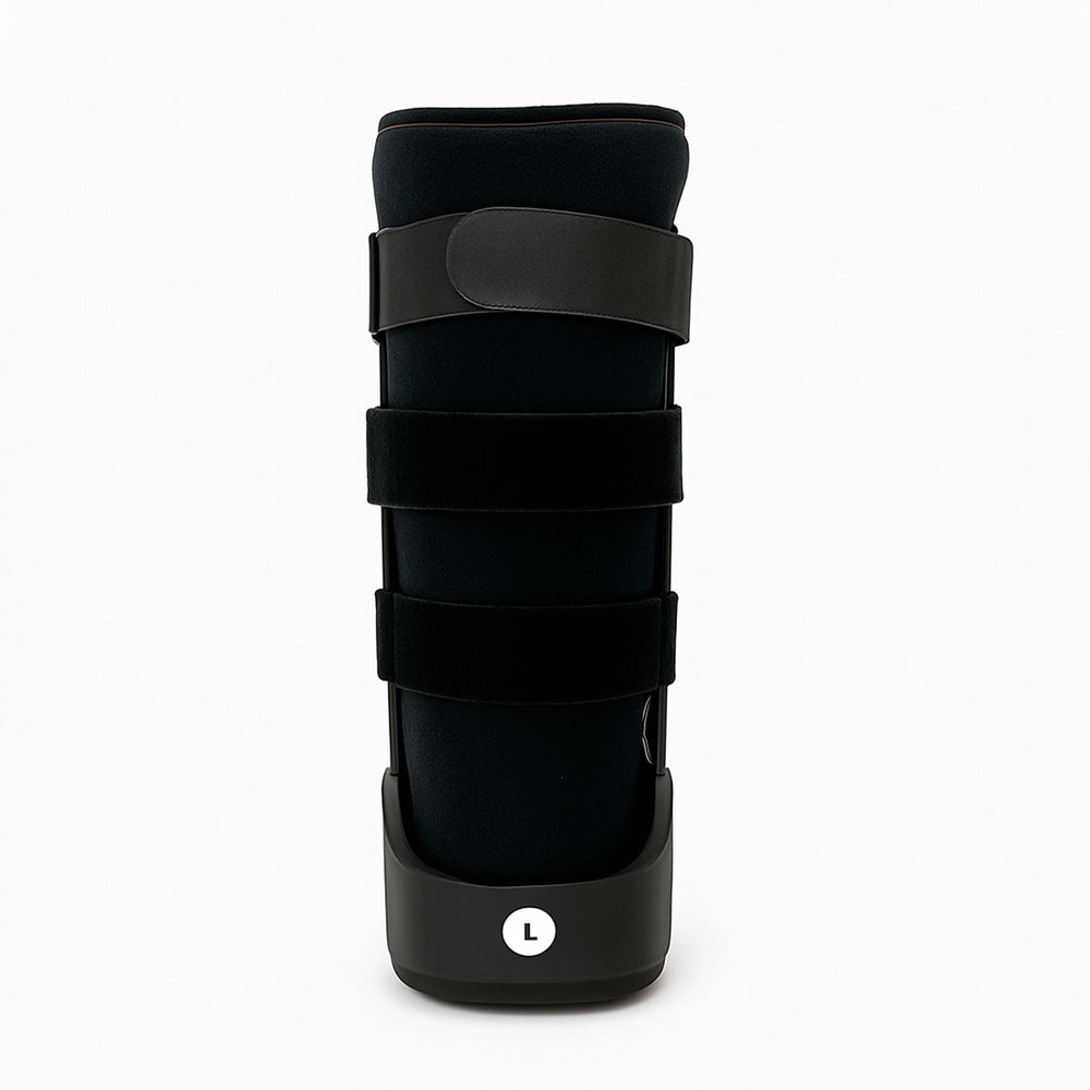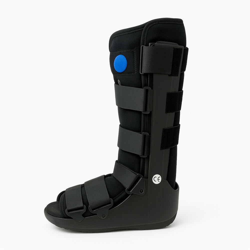 Ortesis tipo bota neumática de tamaño grande, diseñada para inmovilizar y proteger el pie y tobillo tras fracturas, esguinces graves o cirugías. Cuenta con un sistema de cámaras de aire internas ajustables que proporcionan una compresión uniforme, reduciendo la inflamación y el dolor. Su estructura está fabricada en material plástico rígido para brindar estabilidad y protección, con correas de velcro ajustables para una mejor sujeción. La suela es antiderrapante y acolchonada para mayor comodidad al caminar.