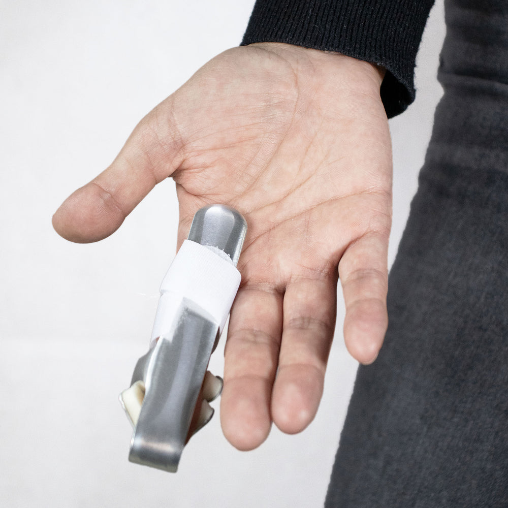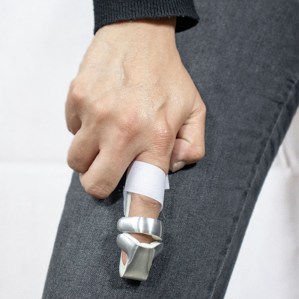 Férula tipo beisbolista en color gris, talla mediana, diseñada para inmovilizar la mano y muñeca en una posición funcional. Ideal para recuperación de fracturas o lesiones tendinosas. Fabricada en material transpirable con ajuste de velcro.