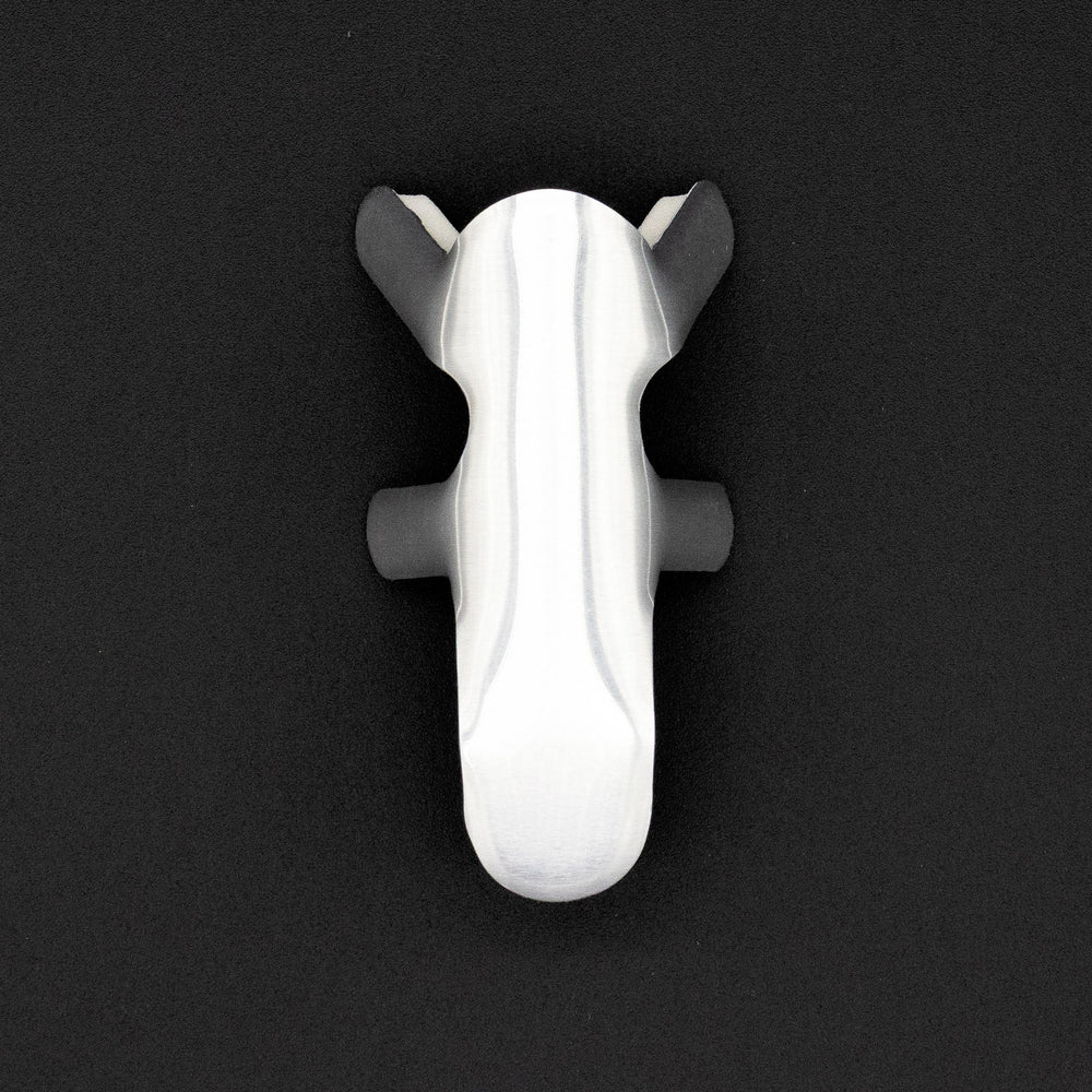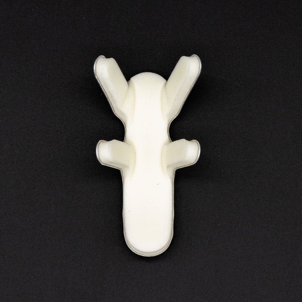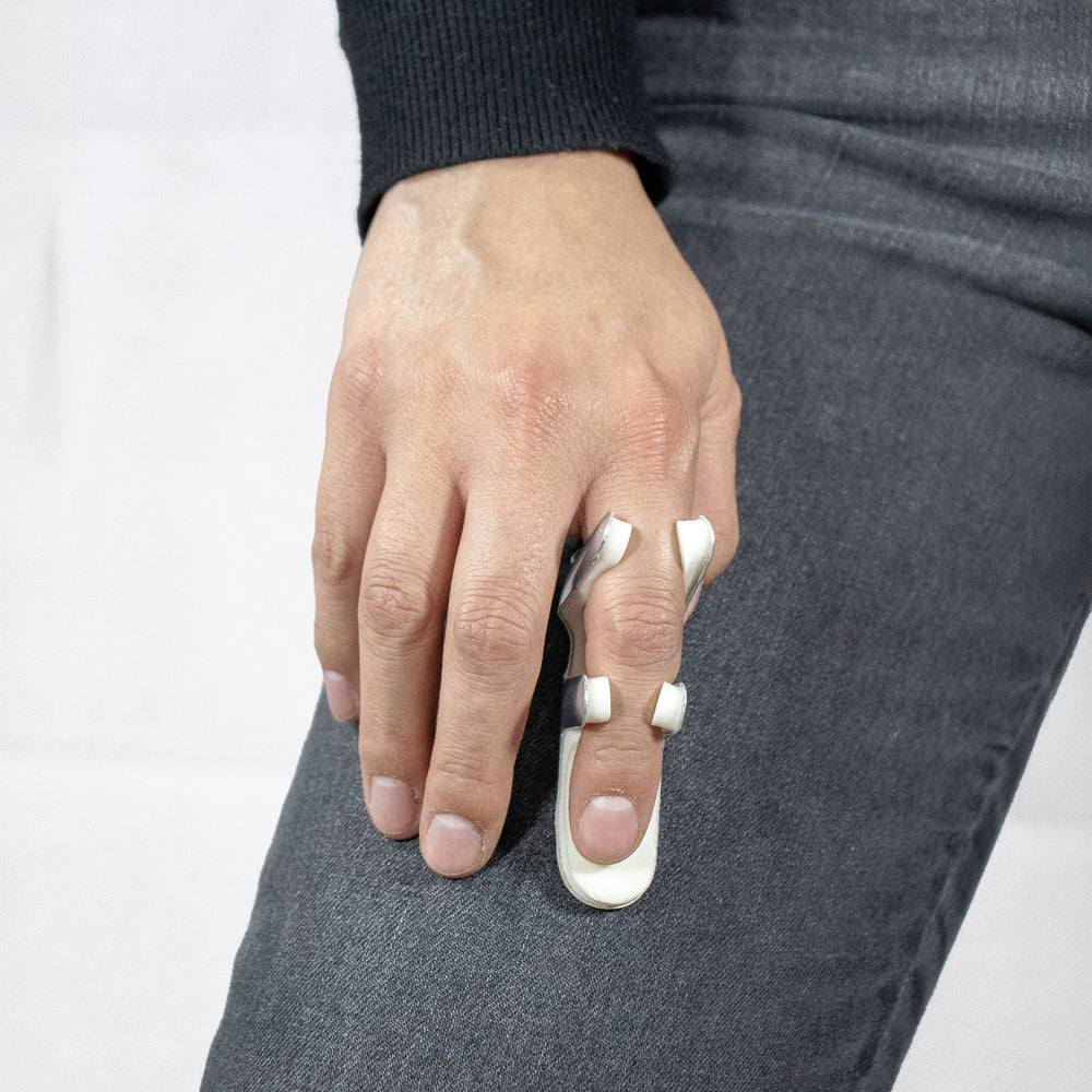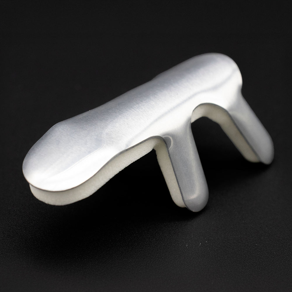 Férula tipo rana en color gris y talla mediana, utilizada para inmovilización de los dedos de la mano en casos de fracturas o lesiones tendinosas. Fabricada en aluminio moldeable con acolchado interno para mayor comodidad.