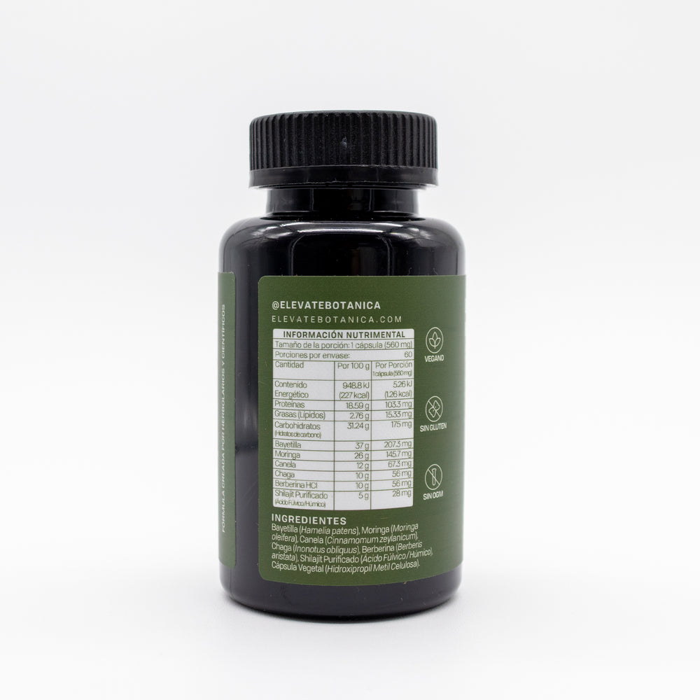 Cápsulas naturales con moringa, chaga, canela y más. Apoya metabolismo y circulación.
