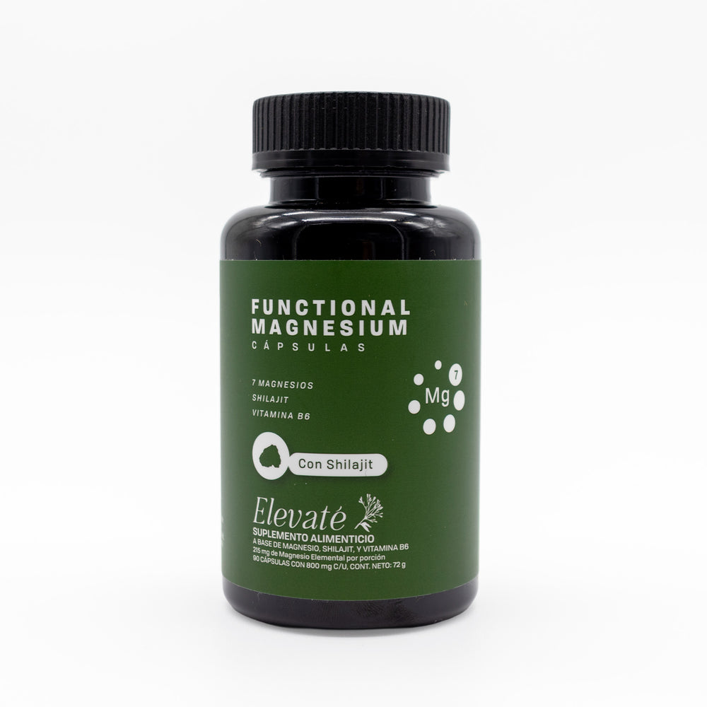 Suplemento alimenticio con 7 formas de magnesio + Shilajit. Apoya salud muscular, relajación y energía.