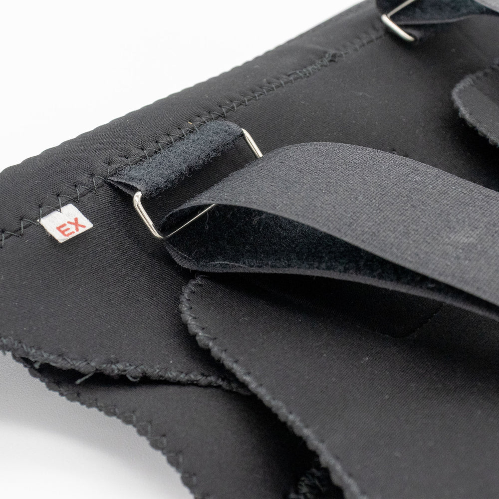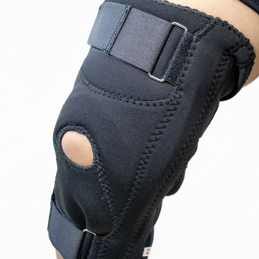 Rodillera mecánica con broches y rótula abierta en color negro. Diseñada para ofrecer estabilidad en lesiones ligamentarias o postoperatorios. Cuenta con bisagras laterales que permiten un movimiento controlado de la rodilla.